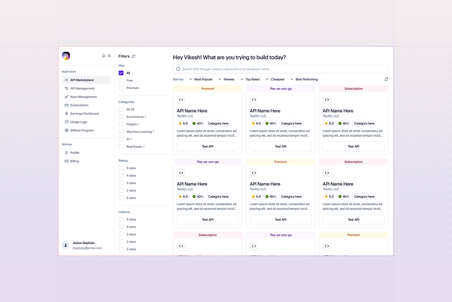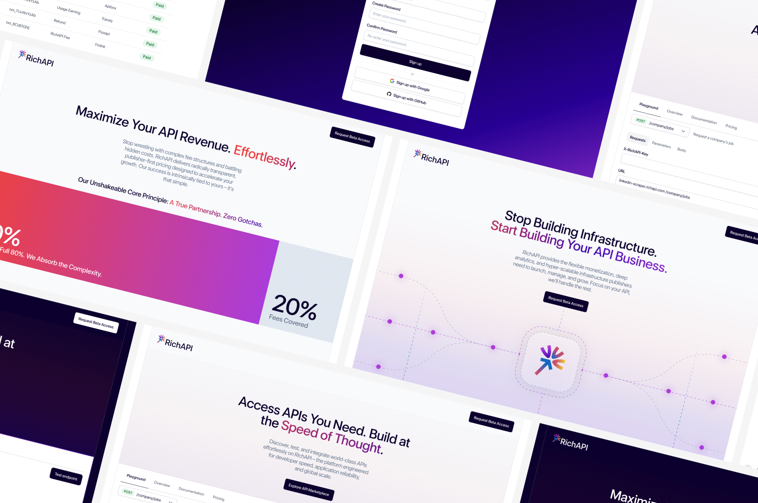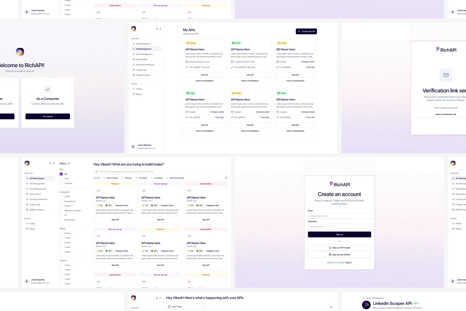 Balancing developer profitability with customer satisfaction is tricky. RichAPI needed a UI that makes earnings easy to understand while keeping API exploration intuitive. The platform and brand had to show that a creator-led marketplace can be both rewarding for devs and dependable for buyers—bringing clarity, credibility, and scalability into one cohesive system.