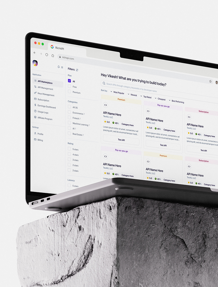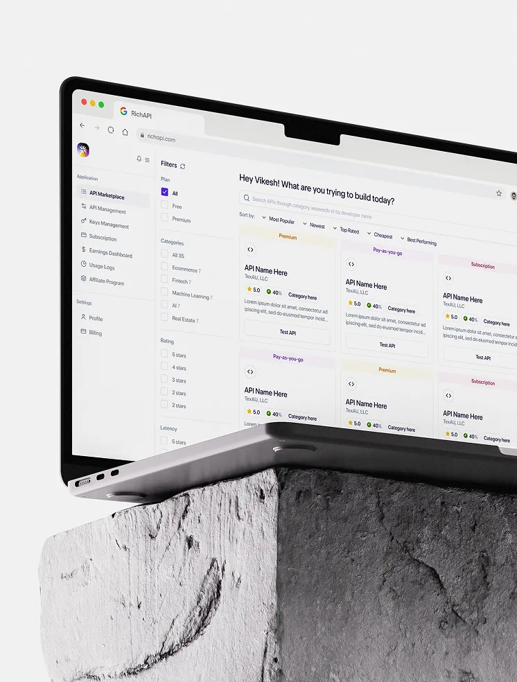 RichAPI is a creator-first API marketplace that gives developers a more profitable way to monetize their work. It centralizes everything—earnings, API calls, active users, and AI-powered insights—so creators can grow both revenue and product quality. Customers get access to a wide range of API categories across multiple industries, making discovery fast and practical. Our branding highlights the “magic” of APIs and the breadth of what RichAPI offers.